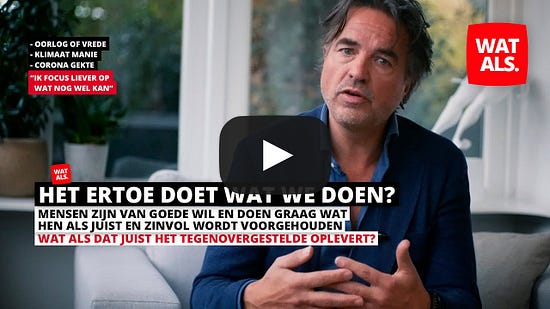 En vooral, hoe dan? Als we allemaal maar gewoon mensen zijn? En allemaal natúúrlijk graag meehelpen aan dat wat ons als goed en zinvol wordt voorgehouden? Graag ons steentje bijdragen. Ons moeite getroosten. En kennelijk bereid zijn om onze eigen gezondheid, onze vrijheid, economie, onze toekomst en die van onze kinderen op het spel te zetten. Alles om het volgens sommigen mogelijke verlies van juist die dingen als gevolg van 'het klimaat', 'het virus' of 'de Russen' tegen te gaan? Wat als onze goede intenties en die van onze leiders misschien juist averechts werken?