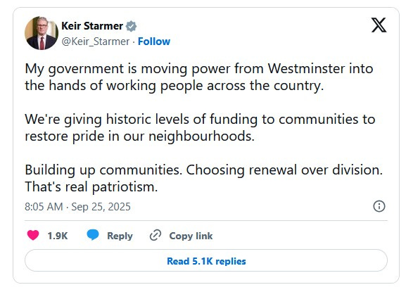 Dus wat is zijn reactie? Een onhandige en ronduit teleurstellende omkoping. Starmers grote idee voor de conferentie (naast het feit dat hij Farage “vies” noemt (iets wat het publiek al weet, maar waar het allang niet meer om maalt)) was de aankondiging van een investering van £5 miljard voor 339 “over het hoofd geziene” gemeenschappen in het Verenigd Koninkrijk, om te investeren in winkelstraten, parken en openbare ruimtes.