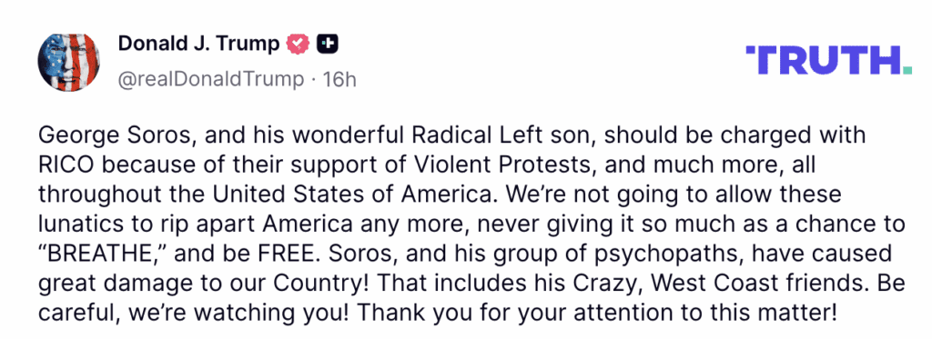 “Ze moeten worden vervolgd op grond van de RICO-wet voor hun steun aan gewelddadige protesten – en nog veel meer – in de hele Verenigde Staten van Amerika”, verklaarde Trump op Truth Social, waarbij hij de politieke machine van Soros vergeleek met een georganiseerde misdaadorganisatie, bericht Rairfoundation.